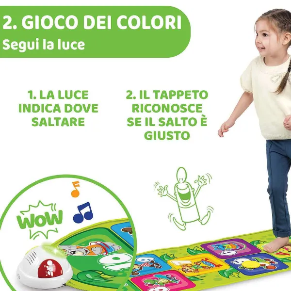 - Gioco Dei Colori: Il Pannello Elettronico Indica Al Bambino Il Colore Del Tappeto Su Cui Saltare E Riconosce Se Ha Raggiunto La Casella Corretta, Emettendo Luci E Suoni Di Incoraggiamento
