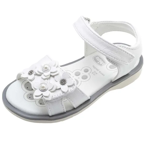 - Sandalo Da Bambina Con Applicazione Di Fiori Perle E Strass, Con Doppia Regolazione Velcro