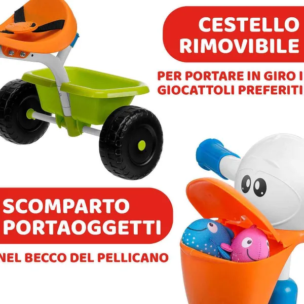 - Divertente Triciclo Chicco 2In1 Con Il Muso Di Un Buffo Pellicano E I Pedali Con La Forma Delle Sue Zampine, Dotato Di Pratico Maniglione Telescopico Rimovibile