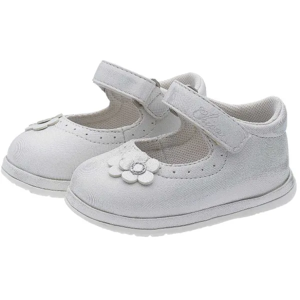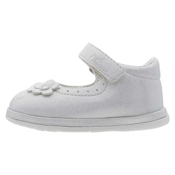 - Ballerina Primi Passi Da Bambina In Materiale Bianco Iridescente Con Fiori Applicati. Cinturino Regolabile Con Velcro