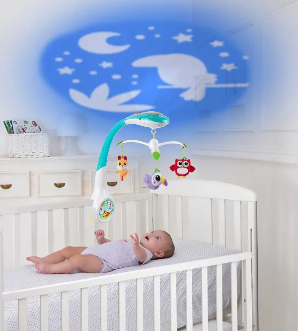 - La Giostrina Elettronica Proiezione Foresta Magica È Dotata Di 3 Morbidi Peluche, 3 Melodie Rilassanti Ed Un Proiettore Che Cambia I Colori Autonomamente Al Ritmo Di Musica.