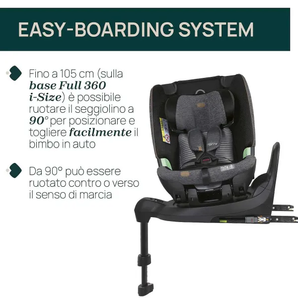 - Il Sistema Ad Accesso Facilitato Semplifica Il Posizionamento Del Bambino Grazie Alla Rotazione Della Seduta Verso L’Adulto In Caso Di Utilizzo Del Seggiolino Sia In Senso Contrario Di Marcia Sia In Senso Di Marcia.