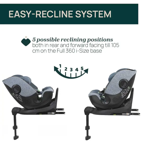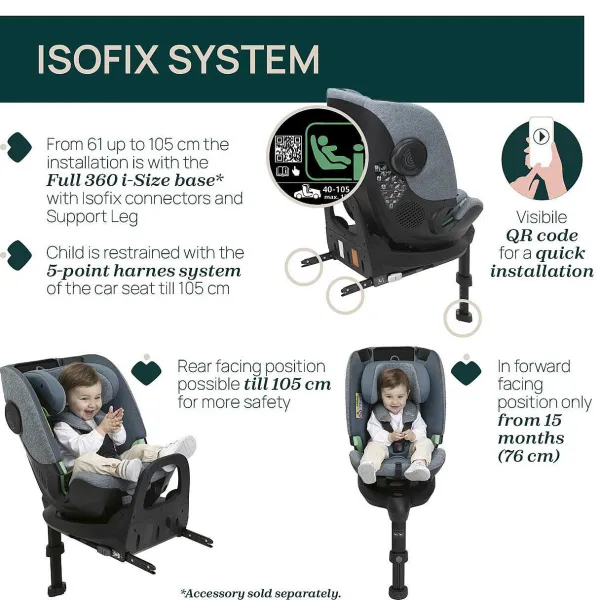- Doppia Installazione: Tramite Full 360 I-Size Base, Isofix, Support Leg E Sistema Di Cinture A Cinque Punti Fino A 105 Cm (Circa 4 Anni); Tramite La Cintura Del Veicolo A Partire Dai 100 Cm (Rimuovendo La Base).