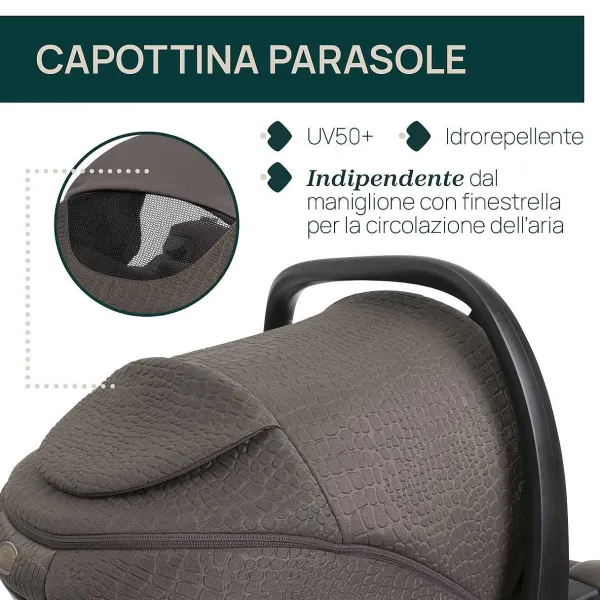 - Dotato Di Capottina Parasole Idrorepellente Uv50+ E Di Una Comoda Finestrella Per Garantire Una Maggiore Ventilazione Dell’Aria.